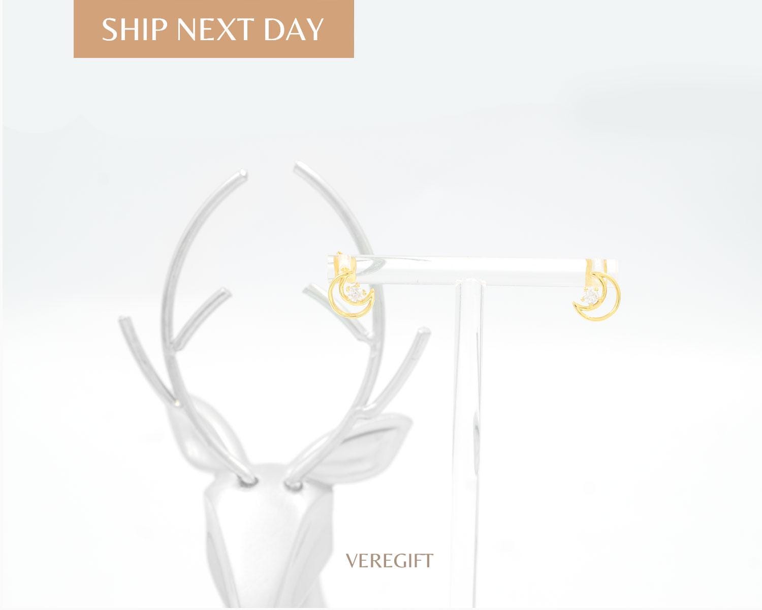 14K Gold Moon Stud Earrings: Sterling Silver Zircon Gemstone